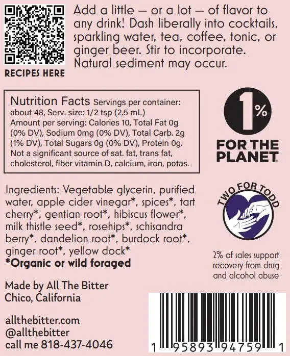 Ingredients:Non-GMO vegetable glycerin, purified water, apple cider vinegar*, spices*, cherry*, hibiscus flower*, rosehips*, gentian root*, milk thistle seed*, dandelion root*, burdock root*, ginger root*, schisandra berry*, yellow dock root* *Organic or wild foraged