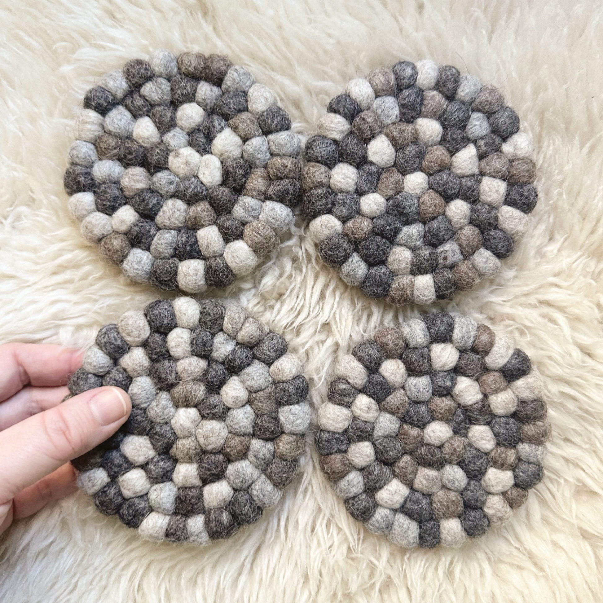 Made from 100% New Zealand wool, each set of four coasters is handcrafted by fair trade artisans in Nepal and assembled and packaged with love in our New Jersey studio.