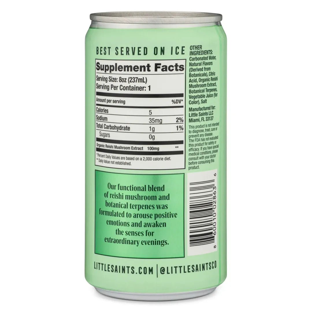 Ingredients: Carbonated Water, Natural Flavors, Monk Fruit Juice Concentrate, Botanical Terpenes, Organic Reishi Mushroom Extract, Citric Acid, Salt, Turmeric (for color)